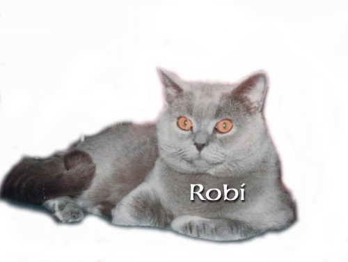 Es ist fast unglaublich, wie treu, verständig, anhänglich und menschenbezogen dieser Kater war. Das hat er auch meistens an seine Kinder vererbt. Robi versuchte auch, seine Menschen zu beschützen, was einmal der Friseuse Angst einjagte, die meine Mutter mit „gefährlichem“ Haarspray besprühte. Eigentlich ist er keine typische Schoßkatze, aber schnurrend und schmachtenden Blickes auf Frauchens Schoß liegen war das größte für ihn! Er schien jedes Wort zu verstehen und „sprach“ auch zu seinen Menschen, was dann wie ein Brabbeln aus „wa-wa“-Lauten klang. – Robi stammte aus uralten blauen Briten-Linien. Zu seinen Ahnen gehört der legendäre „Rocky Mistigri“ sowie die berühmten De Rijp’s Katzen aus den Niederlanden. Züchter, die seit 20 Jahren „dabei“ sind, erinnern sich sicher. Robi ist achtzehn Jahre alt geworden. Sein Söhnchen „Oisin“, seine inzwischen auch fast 18jährige Tochter Esmie, seine Enkelinnen Murnie und Katermädchen trösten uns über seinen Verlust hinweg. |